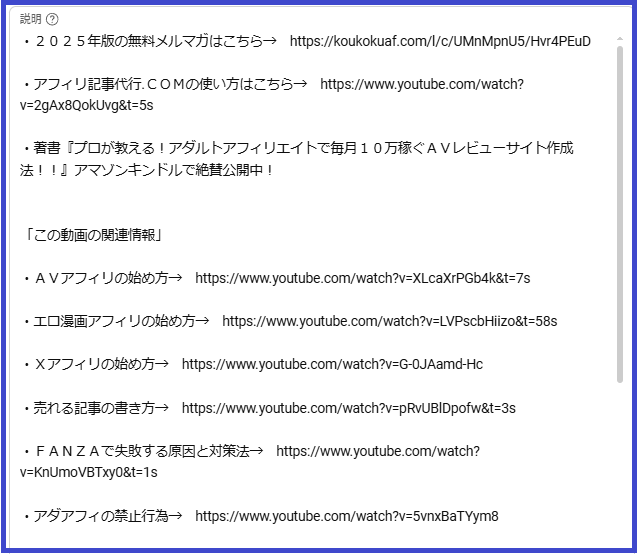 私も含めて新参チャンネルの場合、スタートアップ時は検索から流れてくるアクセスしか見込みはないので、ここは手抜きしないでくださいね。