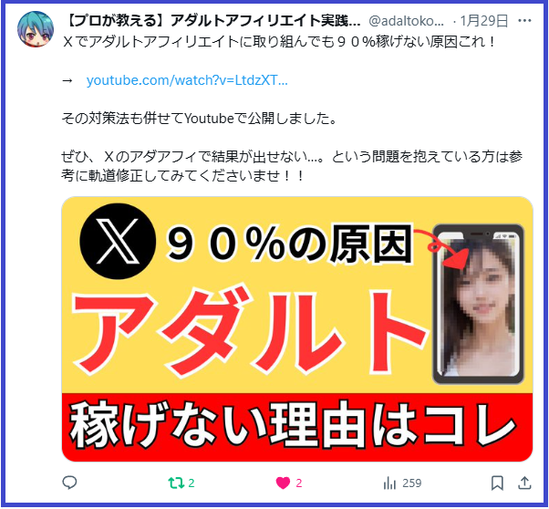あなたが現在SNSやブログを活用しアダルトアフィリに取り組んでいる場合、Youtube運営していることをアナウンスしてください。