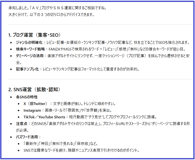 ChatGPTは“アダのマーケティング補助”としては最強。しかし“性的文章”と“本編レビュー”は一切できない。
