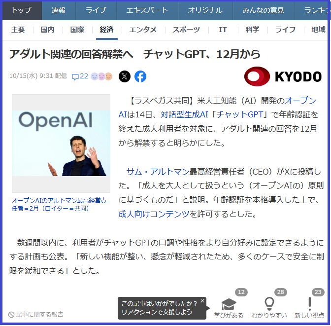 Yahooの「ChatGPTアダルト解禁」の誤解を正す