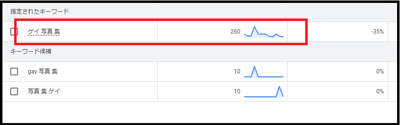 一例をあげれば、以下は需要の高いゲイにフォーカスした写真集キーワードのボリュームですが260と少ないです。