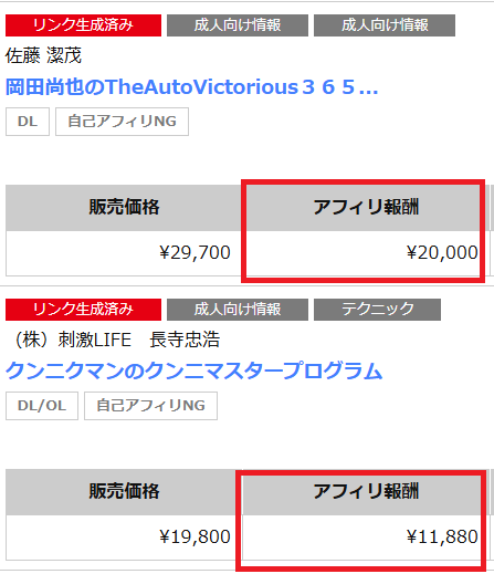 一方、難易度が高いのが私が販売しているようなアフィリエイトで稼ぐ系やアダルトビジネス系のコンテンツです。
