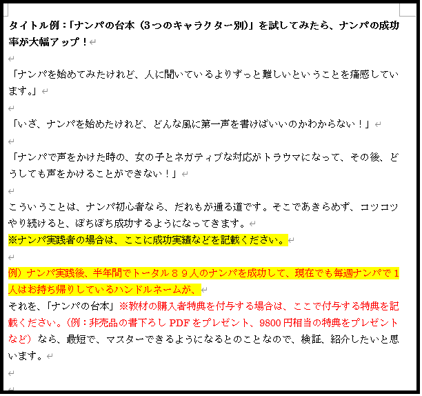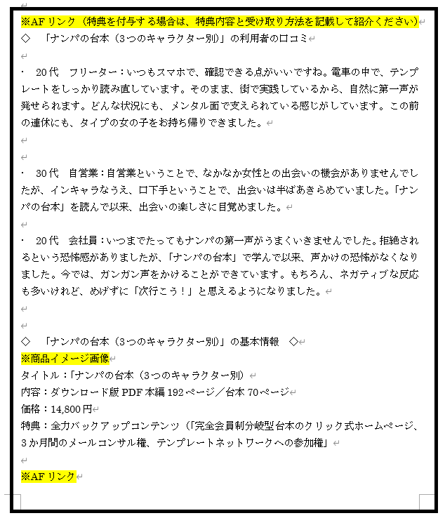 特典紹介や画像差し込み箇所には目印がありますので自分では売れる記事が書けないという場合は、こちらテンプレを活用してみてください。